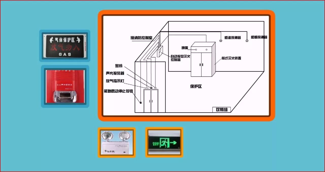 圖1-6 防護(hù)區(qū)內(nèi)的疏散通道及出口,應(yīng)設(shè)消防應(yīng)急照明燈具和疏散指示標(biāo)志燈。防護(hù)區(qū)內(nèi)應(yīng)設(shè)火災(zāi)聲音報(bào)警器,必要時(shí),可增設(shè)閃光報(bào)警器。防護(hù)區(qū)的入口處應(yīng)設(shè)火災(zāi)聲光報(bào)警器和滅火劑噴放指示燈,以及防護(hù)區(qū)采用的相應(yīng)氣體滅火系統(tǒng)的永久性標(biāo)志牌(如圖1-6所示)。 滅火劑噴放指示燈信號,應(yīng)保持到防護(hù)區(qū)通風(fēng)換氣后,以手動方式解除。防護(hù)區(qū)的門應(yīng)向疏散方向開啟,并能自行關(guān)閉;用于疏散的門必須能從防護(hù)區(qū)內(nèi)打開。 滅火后的防護(hù)區(qū)應(yīng)通風(fēng)換氣,地下防護(hù)區(qū)和無窗或設(shè)固定窗扇的地上防護(hù)區(qū),應(yīng)設(shè)置機(jī)械排風(fēng)裝置,排風(fēng)口宜設(shè)在防護(hù)區(qū)的下部并應(yīng)直通室外。通信機(jī)房、電子計(jì)算機(jī)房等場所的通風(fēng)換氣次數(shù)應(yīng)不小于每小時(shí)5次。 儲瓶間的門應(yīng)向外開啟,儲瓶間內(nèi)應(yīng)設(shè)應(yīng)急照明;儲瓶間應(yīng)有良好的通風(fēng)條件,地下儲瓶間應(yīng)設(shè)機(jī)械排風(fēng)裝置,排風(fēng)口應(yīng)設(shè)在下部,室內(nèi)氣體可通過排風(fēng)管排出室外。