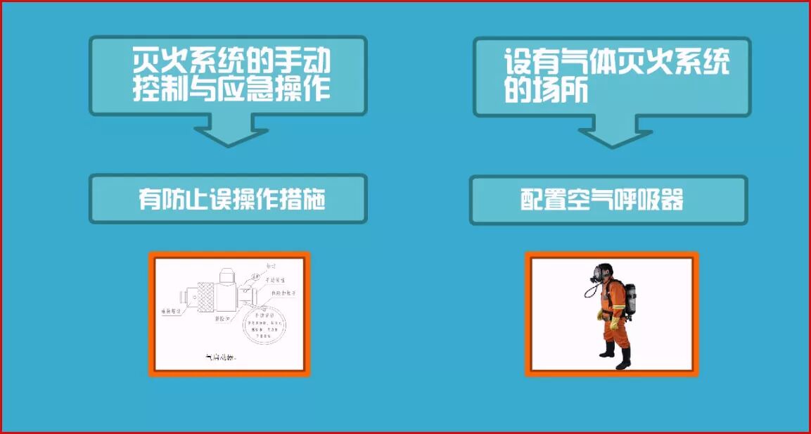 圖1-8 滅火系統(tǒng)的手動控制與應(yīng)急操作應(yīng)有防止誤操作的警示顯示與措施。 設(shè)有氣體滅火系統(tǒng)的場所,宜配置空氣呼吸器(如圖1-8所示)。 知識點(diǎn)總結(jié):