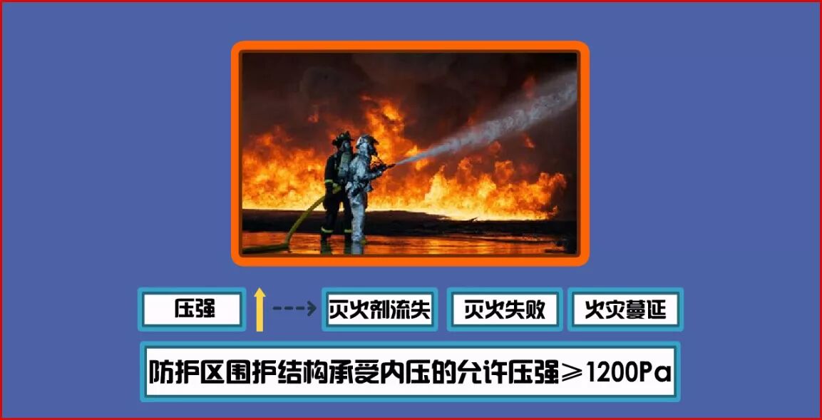 圖1-4 在全封閉空間釋放滅火劑時(shí),空間內(nèi)的壓強(qiáng)會迅速增加,如果超過建筑構(gòu)件承受能力,防護(hù)區(qū)就會遭到破壞,從而造成滅火劑流失、滅火失敗和火災(zāi)蔓延的嚴(yán)重后果。防護(hù)區(qū)圍護(hù)結(jié)構(gòu)承受內(nèi)壓的允許壓強(qiáng),不宜低于1200Pa(如圖1-4所示)。 (四)泄壓能力