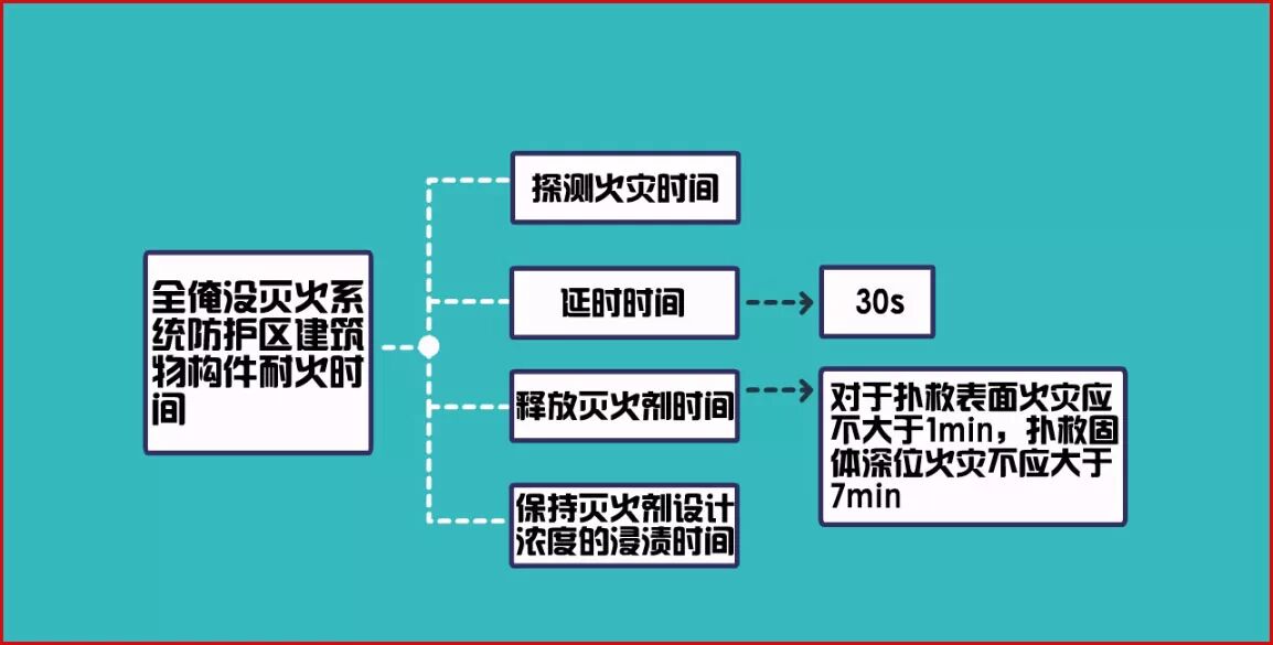 圖1-3 全淹沒滅火系統(tǒng)防護(hù)區(qū)建筑物構(gòu)件耐火時(shí)間(一般為30min)包括:探測火災(zāi)時(shí)間、延時(shí)時(shí)間、釋放滅火劑時(shí)間及保持滅火劑設(shè)計(jì)濃度的浸漬時(shí)間。延時(shí)時(shí)間為30s、釋放滅火劑時(shí)間對于撲救表面火災(zāi)應(yīng)不大于1min;對于撲救固體深位火災(zāi)不應(yīng)大于7min(如圖1-3所示)。 (三)耐壓性能