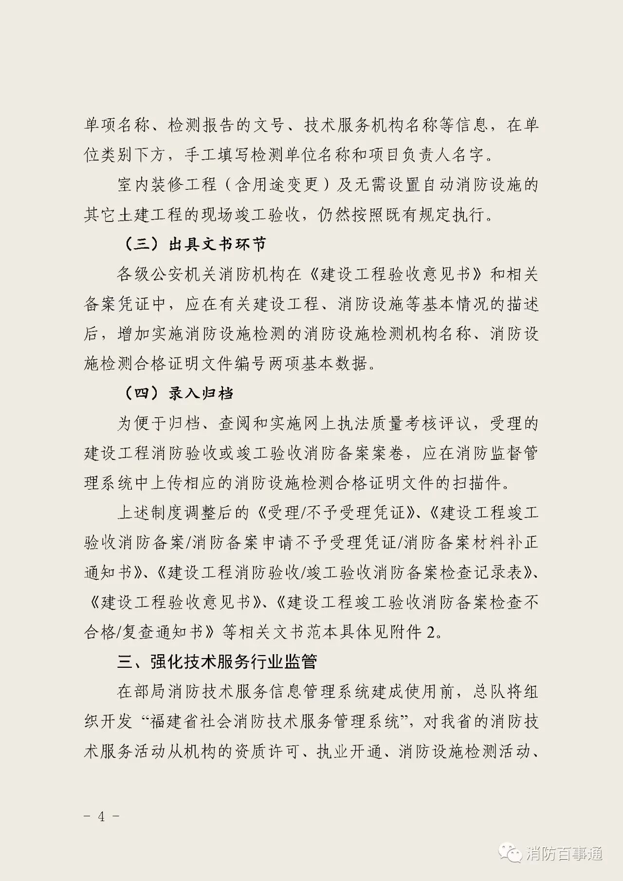 各級公安機關消防機構在《建設工程驗收意見書》和相關備案憑證中,在有關建設工程、消防設施等基本情況的描述后,增加實施消防設施檢測的消防設施檢測機構名稱、消防設施檢測合格證明文件編號兩項基本數據。