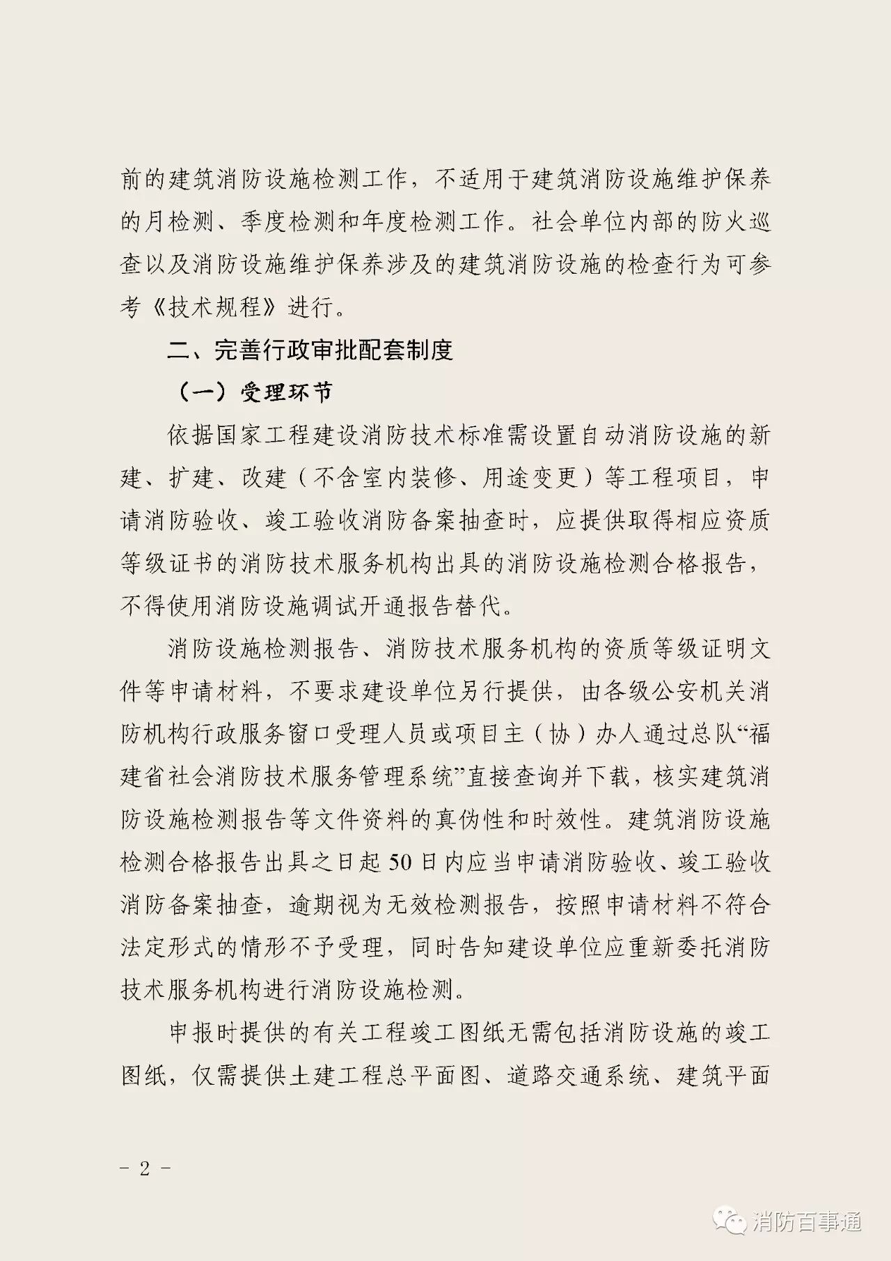 取消消防電梯、消火栓系統(tǒng)、自動噴水滅火系統(tǒng)、火災自動報警系統(tǒng)、防煙排煙系統(tǒng)及通風空調系統(tǒng)、消防電氣、建筑滅火器、消防應急照明和疏散指示系統(tǒng)、其他滅火系統(tǒng)等建筑消防設施子項或者單項的檢查及功能測試,直接采信消防技術服務機構依照《技術規(guī)程》出具的檢測意見和結論。